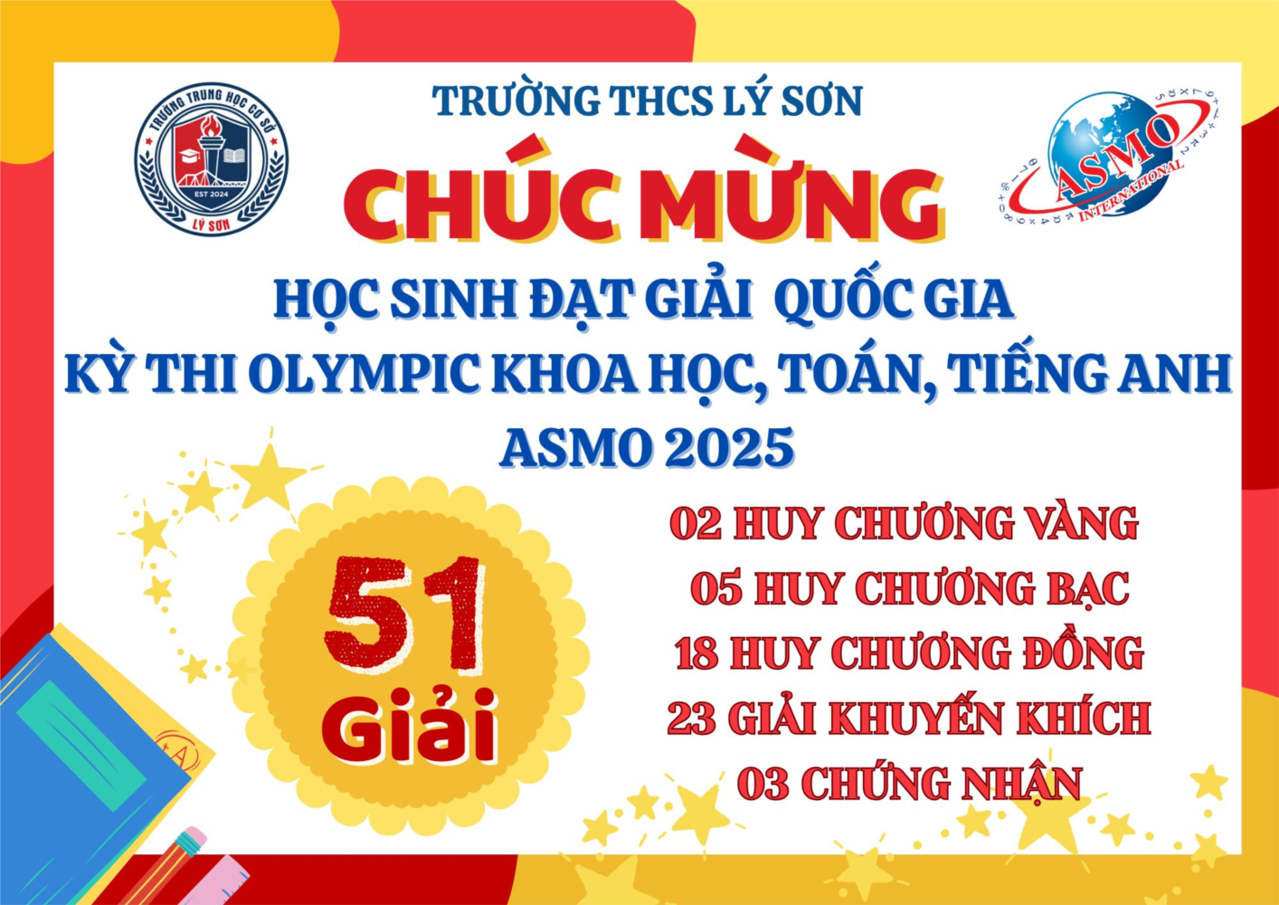 Một lần nữa, ngọn lửa đam mê học tập và tinh thần chinh phục tri thức của học sinh THCS Lý Sơn lại được khẳng định mạnh mẽ trên đấu trường quốc tế. Trong Kỳ thi Olympic Quốc tế ASMO 2025, các em học sinh của nhà trường đã xuất sắc mang về 25 giải thưởng – thành tích khiến gia đình, thầy cô và toàn thể nhà trường vô cùng tự hào.