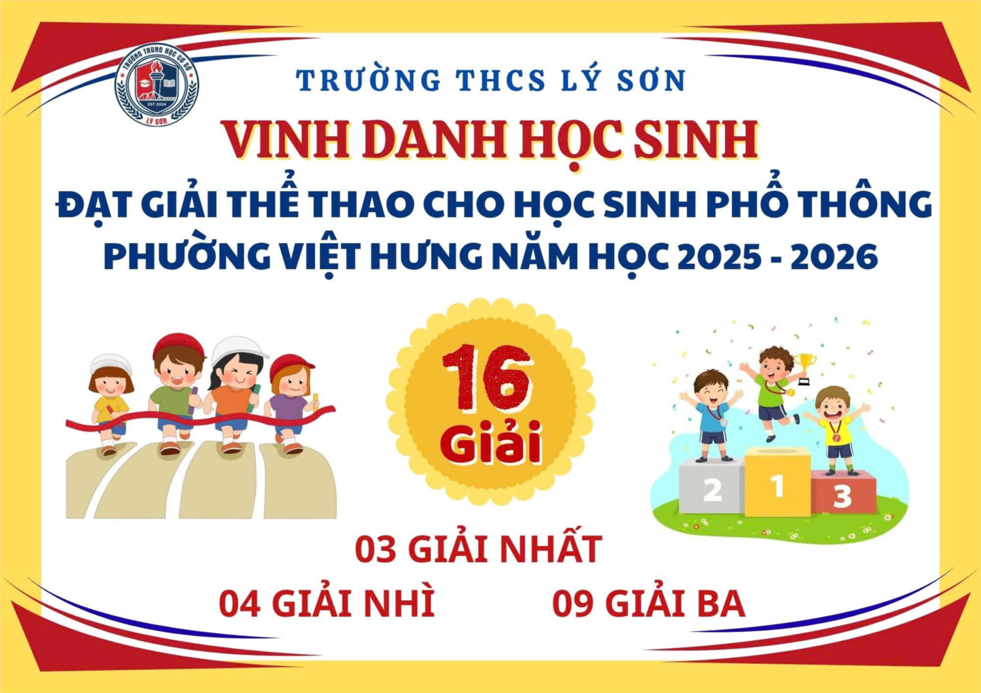 Xin chúc mừng các em học sinh Trường THCS Lý Sơn đã tham gia và xuất sắc đạt thành tích cao tại Giải Thể thao học sinh phổ thông phường Việt Hưng năm học 2025 – 2026!